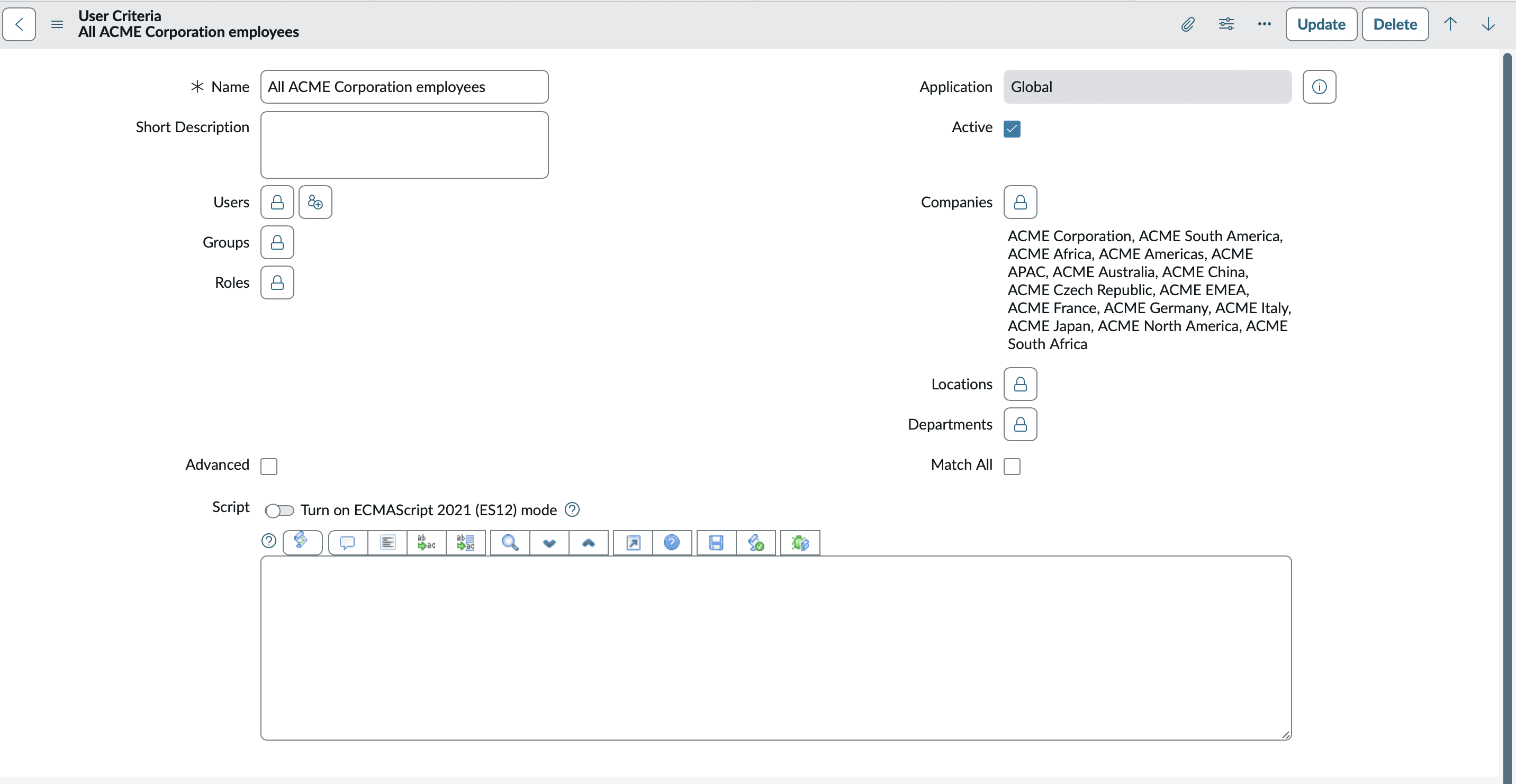 Définition : Un User Criteria est une condition logique (ex: user.role = "ITIL" ETuser.department = "IT") qui détermine si un utilisateur répond à des critères spécifiques. Les conditions se basent sur les informations suivantes :